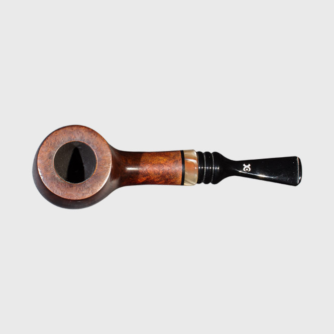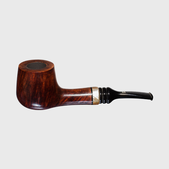 Diese dunklere Hand Made Pfeife wurde seidenmatt poliert und wurde aus Bruyèreholz gefertigt. Der gerade Holm wurde dekorativ ein Ring in perlmuttartiger Optik verziert. Das kurze, schwarze Acrylmundstück wurde mit 3 Rillen und dem Firmenlogo dekoriert. Sie besitzt eine 9 mm Filterbohrung.