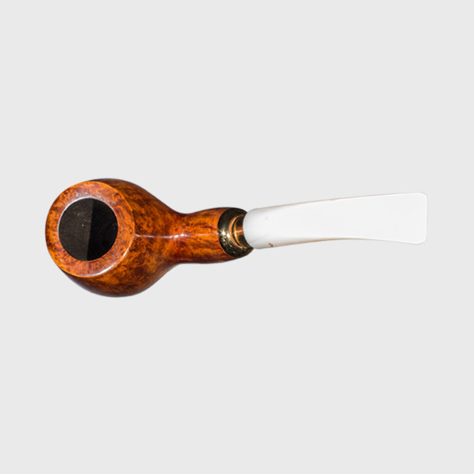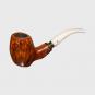 Diese auffällig schöne Bruyèreholzpfeife wurde matt glänzend poliert. Sie lässt sich problemlos für eine Rauchpause abstellen. Der bauchige Holm wurde mit goldfarbenen Ringen verziert. Auf dem hellen Acrylmundstück befindet sich das Firmenlogo. Die Pfeife verfügt über eine 9 mm Filterbohrung.