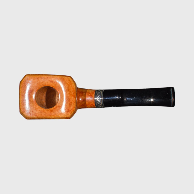 Auffällig wurde der große Pfeifenkopf mit 4 Facetten aus hellen Bruyèreholz gefertigt. In den dekorativen Chromring wurde ein Muster eingearbeitet. Auf dem schwarzen Acrylmundstück befindet sich das Firmenlogo. Die Pfeife besitzt eine 9 mm Filterbohrung.